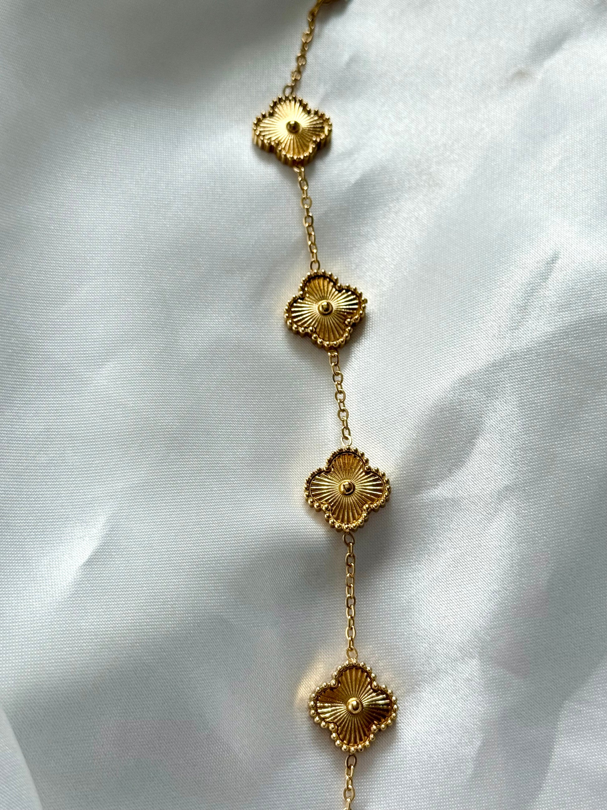 Embrace timeless elegance and subtle symbolism with this exquisite 5 Clover Bracelet. Crafted from durable stainless steel, this bracelet features five delicately designed clover motifs, each adorned with a central dot, symbolizing balance and harmony.