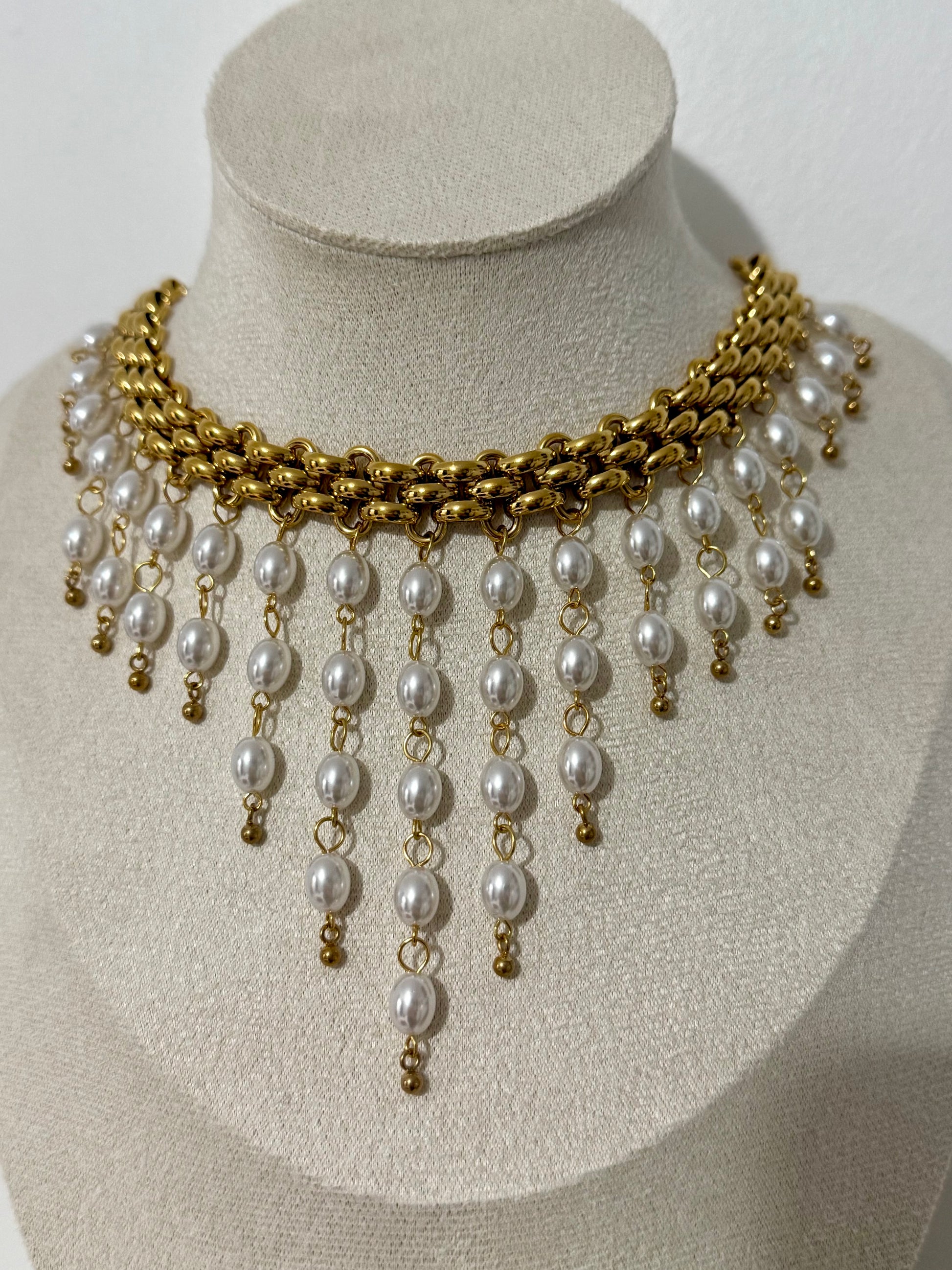 This stylish pearl necklace is perfect for elegant party wear. Crafted with rice pearls, it adds a touch of sophistication to any outfit. The necklace is made from stainless steel, ensuring durability and a sleek finish. Its length is precisely 43cm, making it a versatile accessory for various necklines.