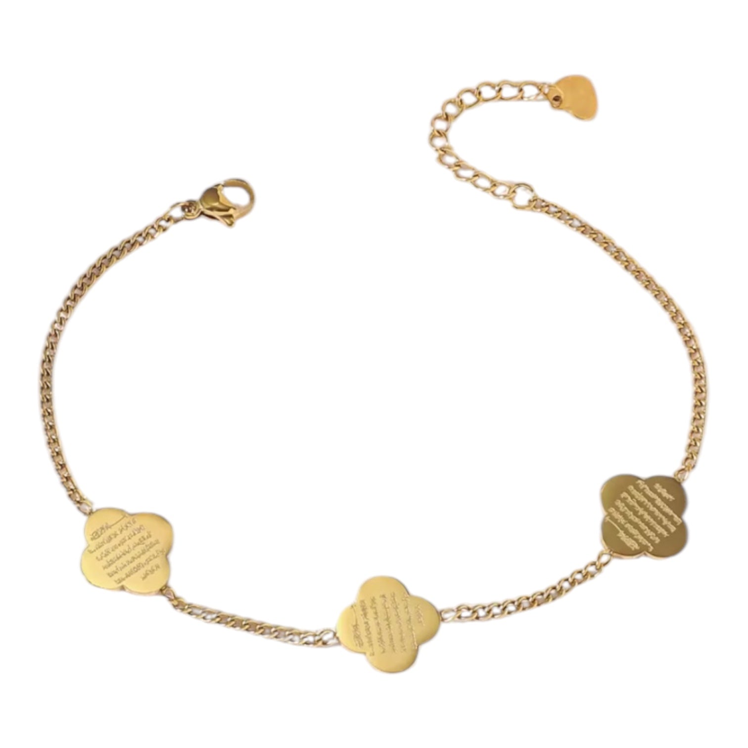 Embrace elegance and spirituality with the Ayatul Kursi Clover Bracelet from the Noor Al-Quloob Collection. Thoughtfully crafted to merge beauty with deep meaning, this stunning piece features a delicate four-leaf clover design, with each leaf engraved with a portion of Ayatul Kursi—one of the most powerful verses in the Qur’an, known for its protection and blessings.