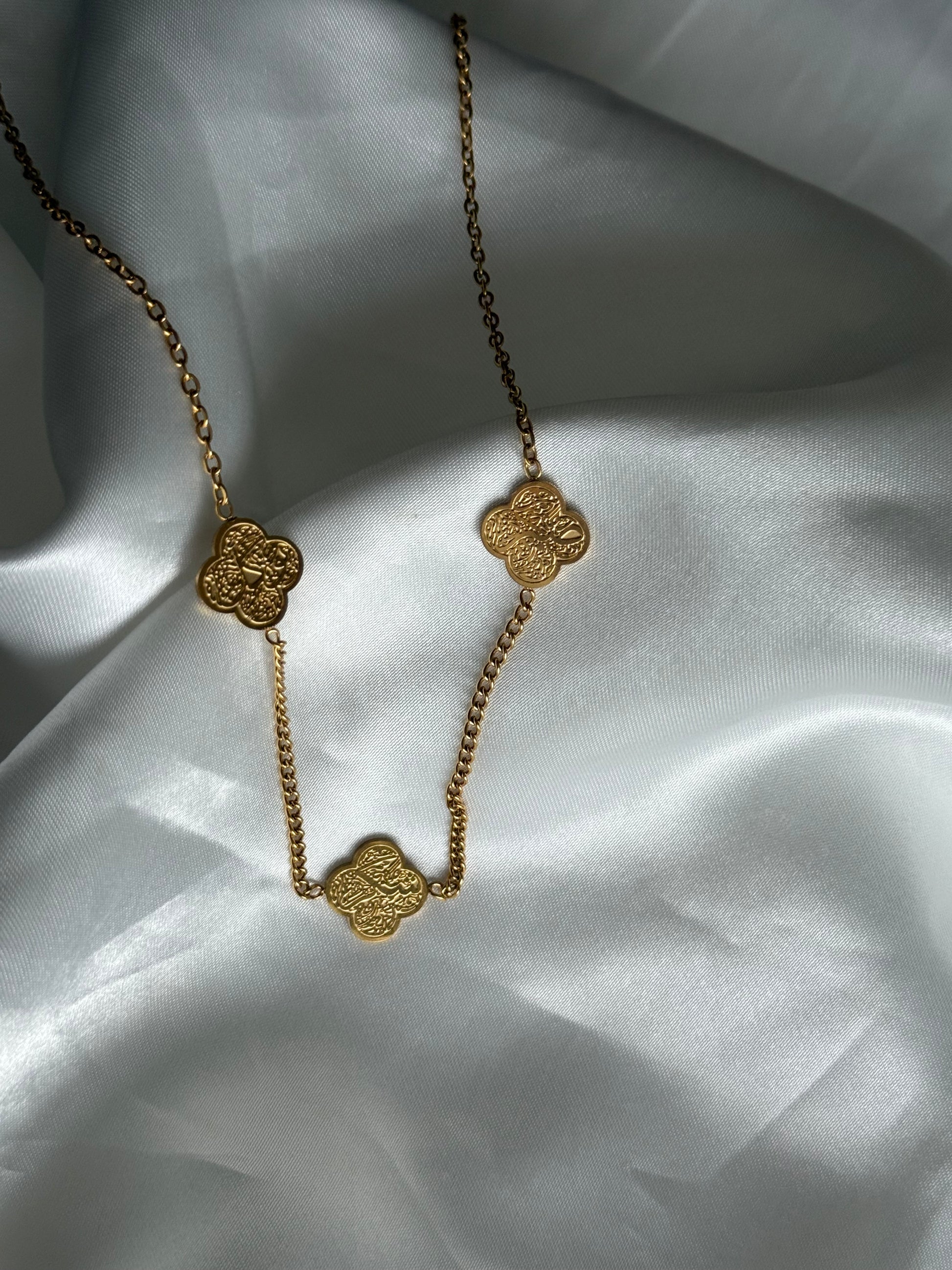 Embrace life’s journey with grace and faith through the Sabr | Shukar | Tawakkal Clover Necklace from the Noor Al-Quloob Collection. This elegant piece features a refined four-leaf clover design, each leaf engraved with one of the three powerful words: Sabr (Patience), Shukar (Gratitude), and Tawakkal (Trust in Allah)—guiding principles for a grounded, faithful life.