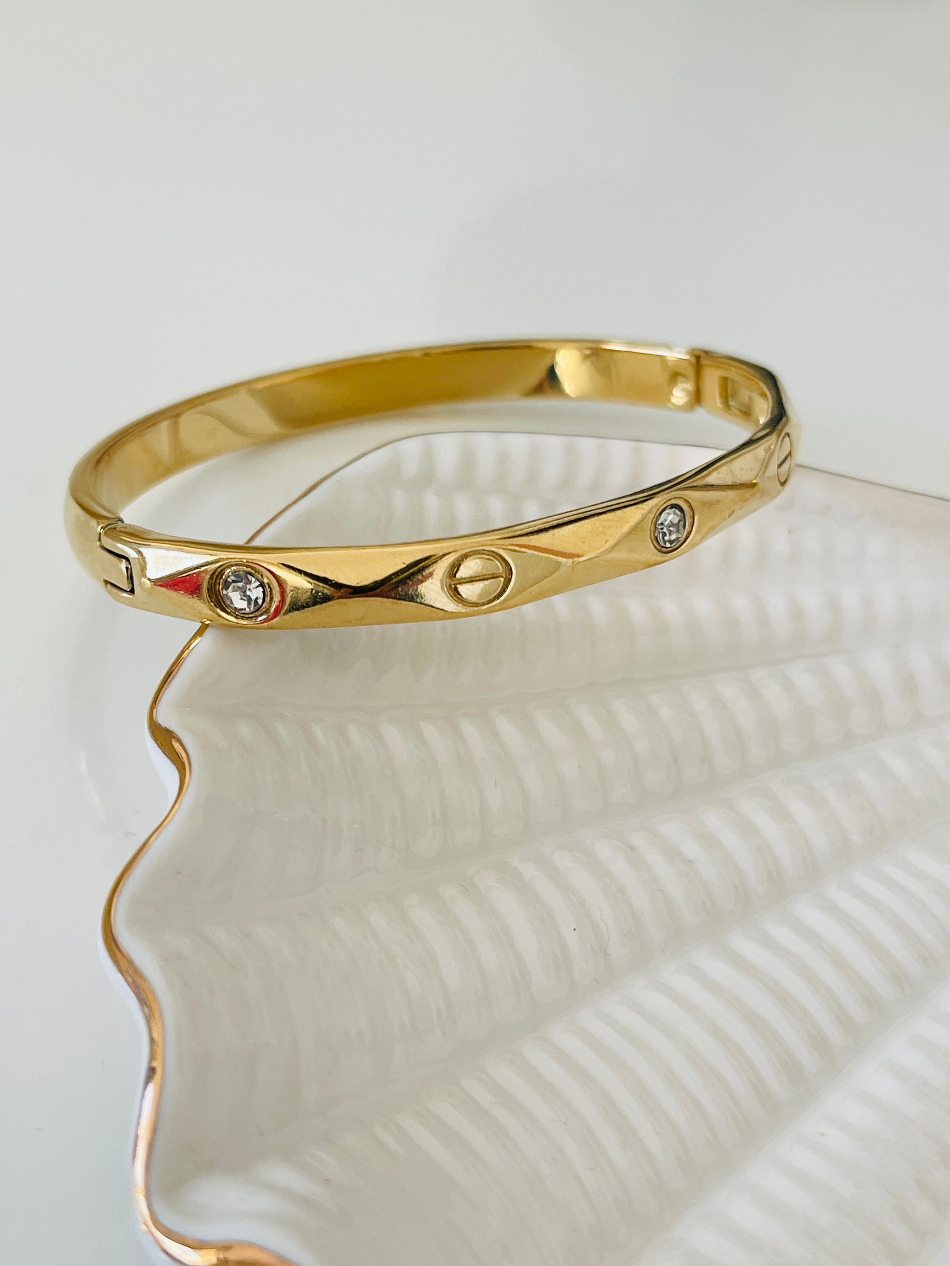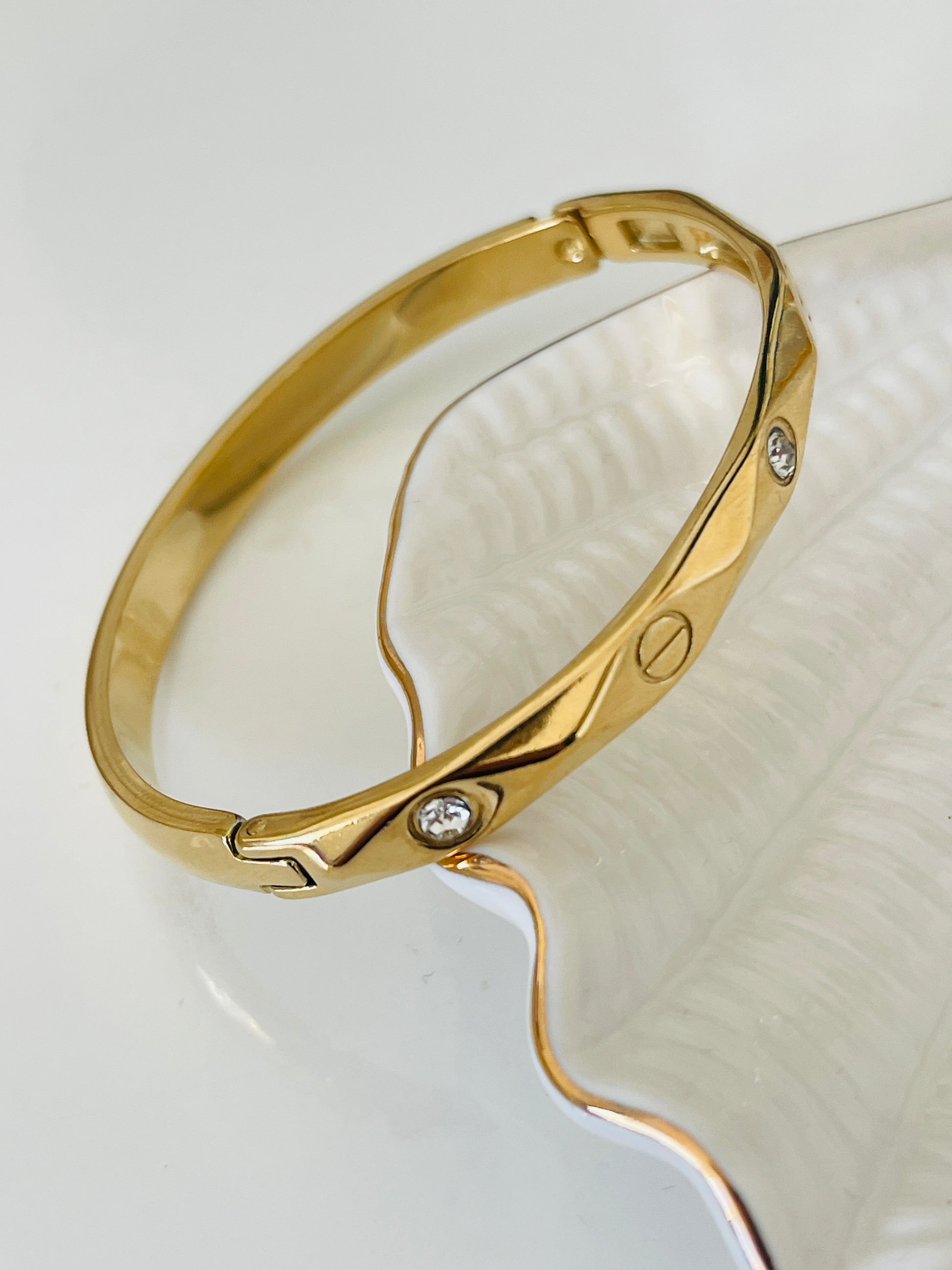 Elevate your style with this elegant adjustable bangle crafted from high-quality stainless steel. Designed to last, this tarnish-free and waterproof piece ensures durability without compromising on aesthetics. Adorned with shimmering stones, the bangle offers a touch of sophistication, making it the perfect accessory for any occasion. Its adjustable design provides a comfortable fit for any wrist size, blending practicality with modern charm. Whether paired with casual wear or formal attire, this versatile piece is a timeless addition to your jewellery collection.